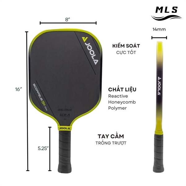 Joola Anna Bright Scorpeus 3S 14mm sẽ là sự lựa chọn hàng đầu dành cho các tay vợt pickleball chuyên nghiệp đang muốn sở hữu một cây vợt pickleball cao cấp bền bỉ, cao cấp, giúp nâng cao trình độ chơi bóng tấn công, sức mạnh và tốc độ.